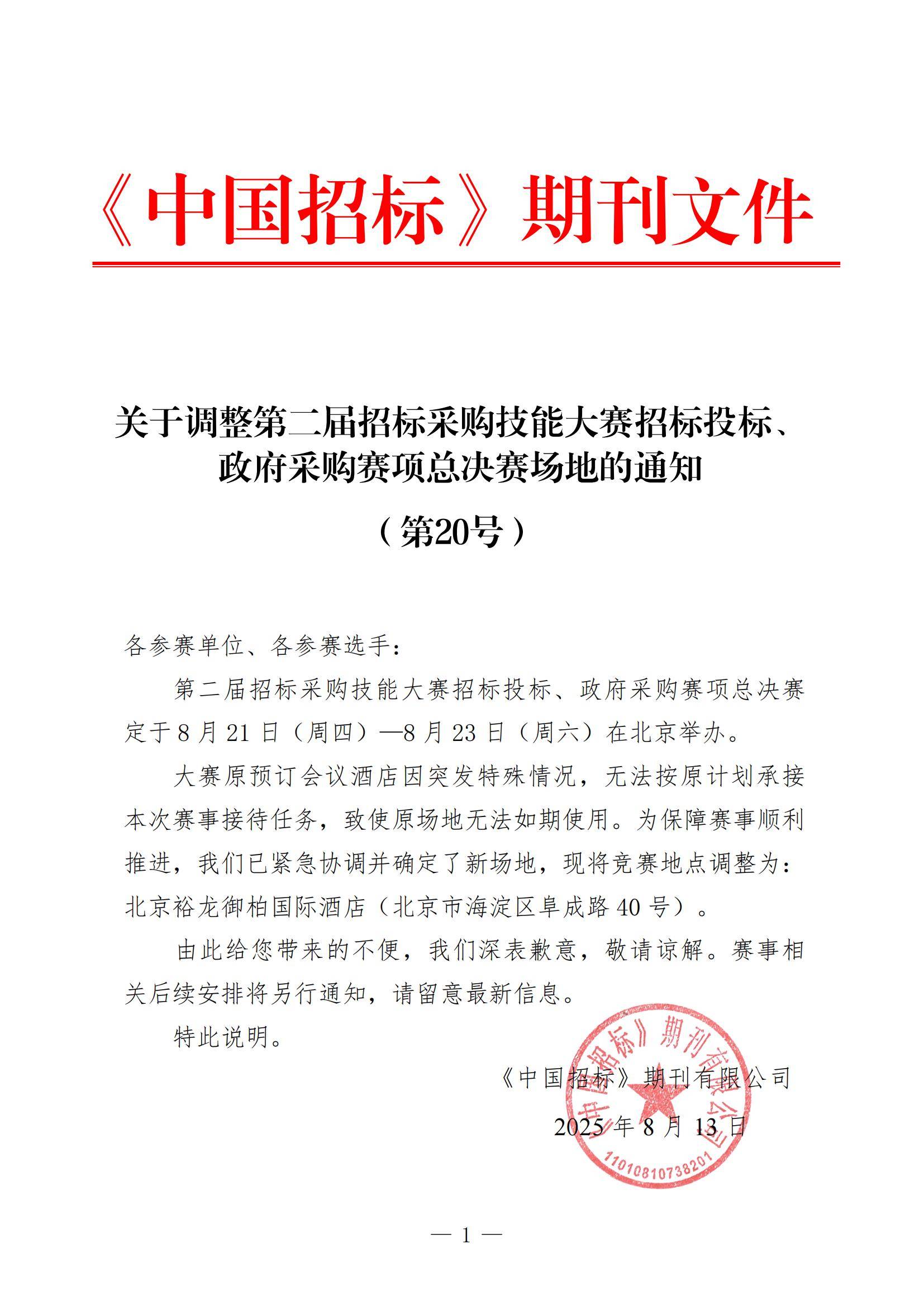 关于调整第二届招标采购技能大赛招标投标、政府采购赛项总决赛场地的通知(第20号)