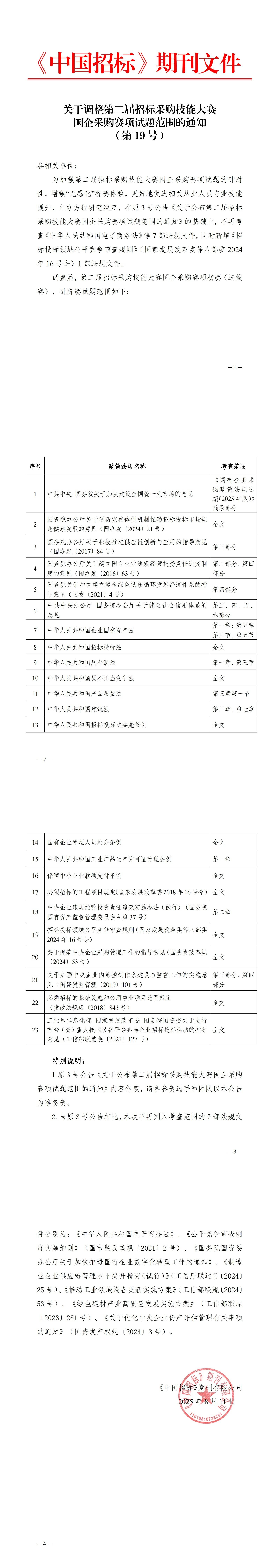 关于调整第二届招标采购技能大赛国企采购赛项试题范围的通知(第19号)