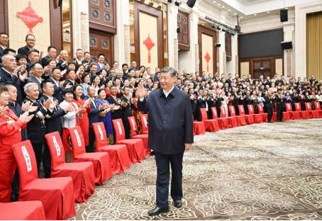 习近平等来到接见现场时,全场响起长时间热烈掌声。习近平向大家挥手致意,不时同代表亲切交流,并同大家合影留念。