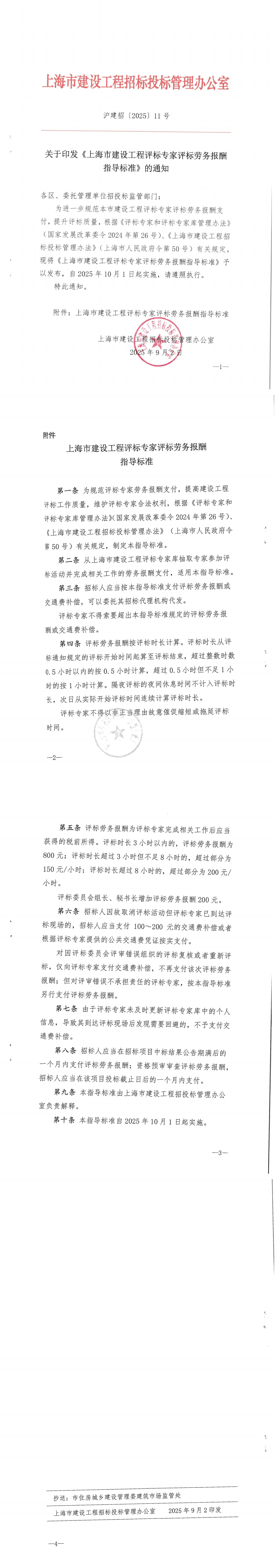关于印发《上海市建设工程评标专家评标劳务报酬指导标准》的通知(沪建招〔2025〕11号)