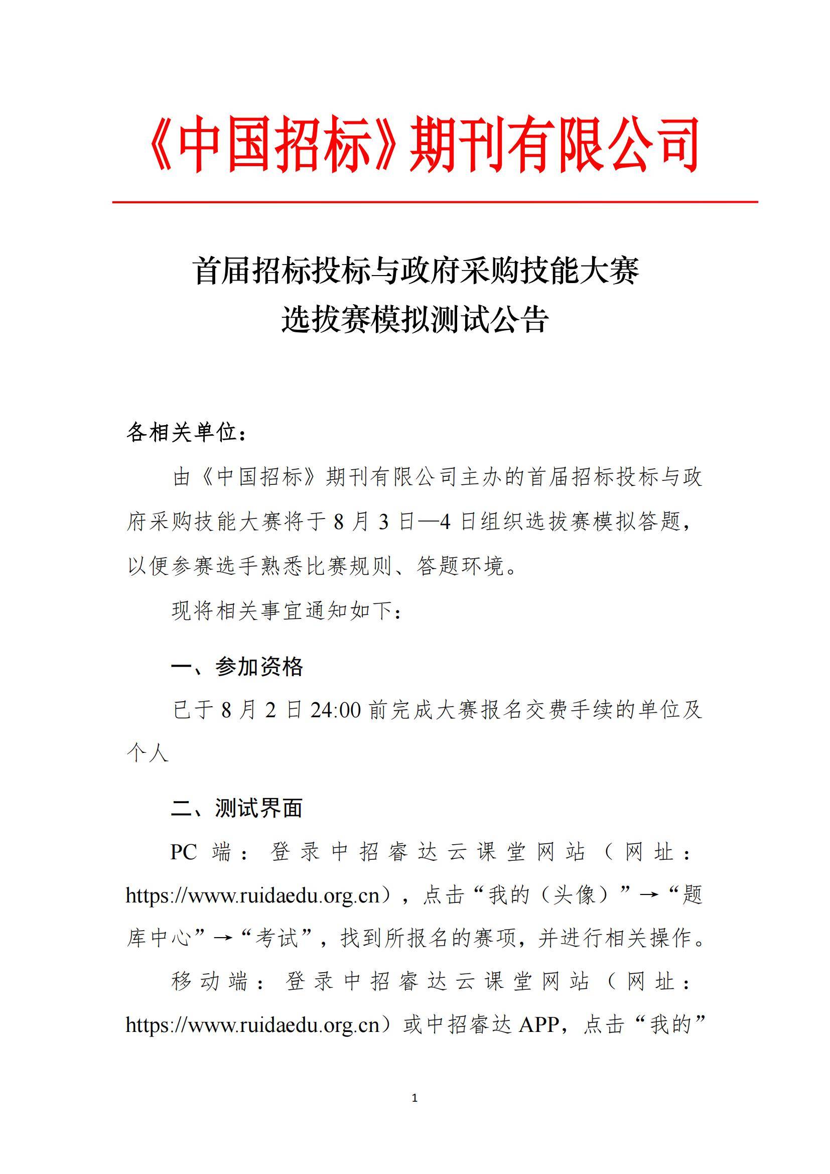 首届招标投标与政府采购技能大赛选拔赛模拟测试公告