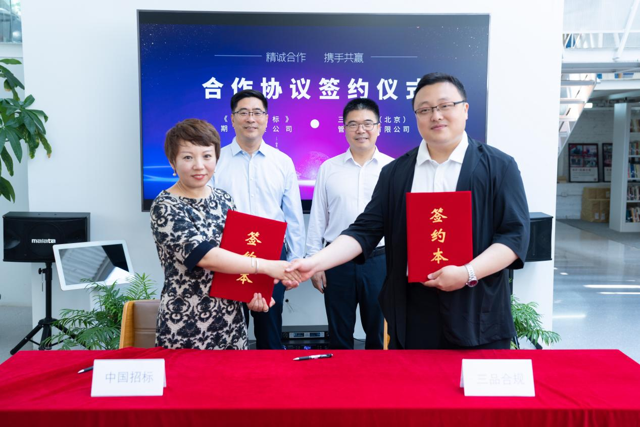 三品合规总经理夏威、合伙人贾博妍,《中国招标》期刊有限公司业务拓展部负责人李风荣等参加签约仪式。