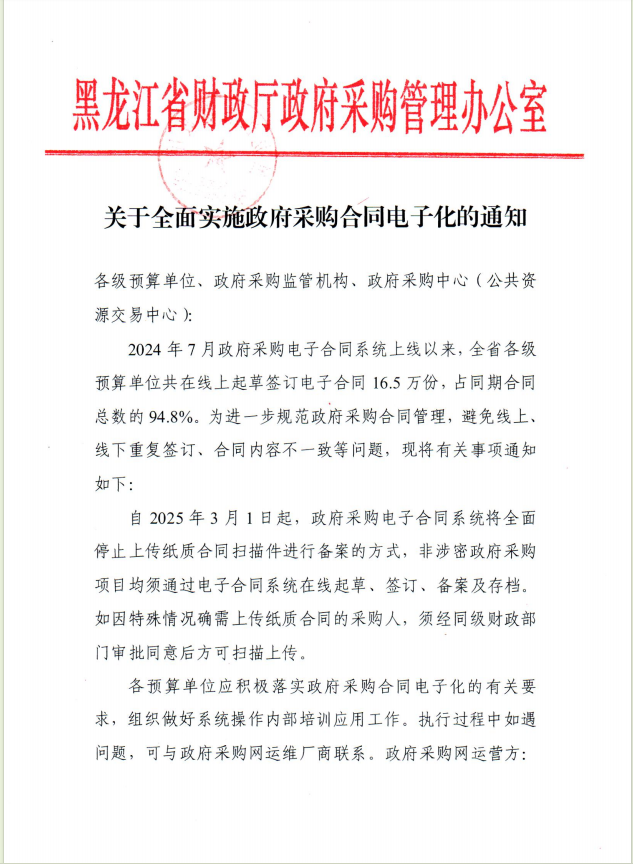 黑龙江省财政厅关于全面实施政府采购合同电子化的通知