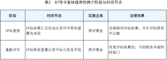 《政府采购法》体系对复核时限有相对明确的规定。87号令第六十四条明确,评标报告签署前的复核发生在评标结果汇总完成后至评审报告签署前;评标报告签署后的重新评审则发生在评标报告签署后至中标公告发布前(见表2)。