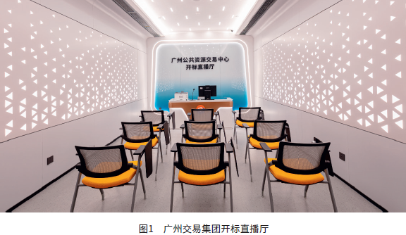 高标准建成40间功能完备的开标室(含10间不见面开标室)、63间评标室、98个具备物理隔离与独立环境调控能力的评标舱(可作为远程异地评标席位)及43间专家过夜客房。这些场地可全面支持分散席位制评审、暗标评审、远程异地评审、评定分离等多种组织形式,为各类项目提供灵活、专业、合规的物理承载与数字协同空间。图1为广州交易集团开标直播厅。