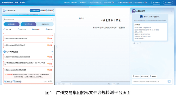 如今,审核招标文件变得高效又精准:上传一份招标文件,系统可在3~5分钟内完成全本扫描,自动定位风险条款、标注疑似问题,并生成结构化的审查报告,整体识别准确率在95%以上。值得一提的是,系统不仅能抓取“明面”的违规表述,还能通过自然语言理解技术,精准识别“变相设置过高业绩要求”“隐形指定品牌或地区”等排斥潜在投标人的隐性条款,打破人工审核局限。例如,在某复建安置房项目中,系统自动判断要求“建筑工程施工总承包二级资质”属于设置过高门槛(项目规模仅约1.7万平方米,三级资质已满足要求),并同步推送法规依据与调整建议,从源头杜绝不合理限制。图4为广州交易集团招标文件合规检测平台页面。