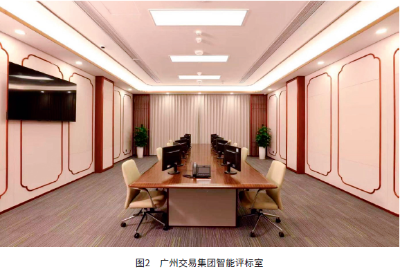 搭建智能管理中枢与全域总控平台,融合物联感知、人工智能与大数据技术,打造集总览决策、中控调度、协同执行于一体的“人员、场地、设备”全域智控体系,全面提升交易平台现场管理服务能力。整合场地环境监测、门禁控制、场内终端设备、智慧见证系统等多源数据,实现场地智能化与交易服务体系的深度耦合与协同运行。建成全时段、全场景、无人化的智慧交易环境,支持场地设备资源的实时感知、动态预测与自动分配,实现设备工况的无感管控和异常智能预警,有效防范运营管理风险,为各类招标投标活动安全有序开展提供全方位保障。图2为广州交易集团智能评标室。