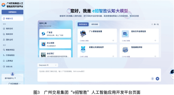 2024年11月,广州创新推出“AI招标文件合规智能检测平台”(AI,即Artificial Intelligen-ce,人工智能),构建“大模型+小模型”双擎驱动的智能审查体系,从源头破解审核难题。广州交易集团联合人工智能科技公司,打造“e招智胜”智慧交易大模型平台,为智能模型训练、推理服务和智能体开发,筑牢技术根基。与此同时,广州开展全域数据治理,汇聚项目审批、交易、监管等各类数据超2.6亿条,累计治理数据总量达160TB(数据存储单位),沉淀形成高质量数据集,并依托平台海量数据和项目案例,建立大模型语料库,持续训练优化模型能力。平台借助大模型与知识图谱技术,构建起“政策法规库、负面清单库、历史案例库”三级知识库,梳理出137个合规检测点与22个错敏词提醒点,覆盖房建市政、水利水务、交通工程等行业领域,助力审核人员精准发现并纠正招标文件排斥限制竞争的条款。图3为广州交易集团“e招智胜”人工智能应用开发平台页面。